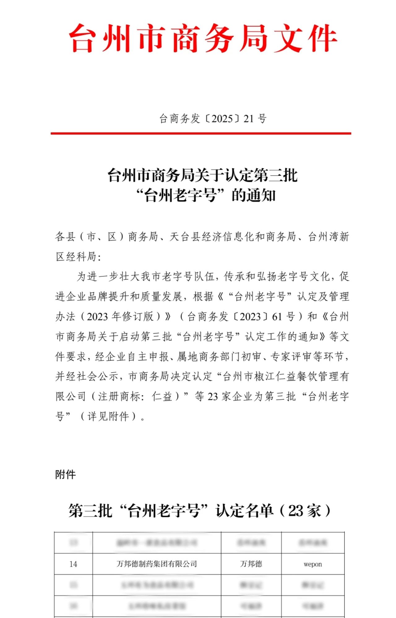 為進(jìn)一步壯大我市老字號(hào)隊(duì)伍,傳承和弘揚(yáng)老字號(hào)文化,促進(jìn)企業(yè)品牌提升和質(zhì)量發(fā)展,根據(jù)《“臺(tái)州老字號(hào)”認(rèn)定及管理辦法(2023 年修訂版)》(臺(tái)商務(wù)發(fā)〔2023]61號(hào))和《臺(tái)州市商務(wù)局關(guān)于啟動(dòng)第三批“臺(tái)州老字號(hào)”認(rèn)定工作的通知》等文件要求,經(jīng)企業(yè)自主申報(bào)、屬地商務(wù)部門初審、專家評(píng)審等環(huán)節(jié),并經(jīng)社會(huì)公示。萬(wàn)邦德制藥集團(tuán)有限公司(注冊(cè)商標(biāo):wepon)榮獲第三批“臺(tái)州老字號(hào)”稱號(hào)。