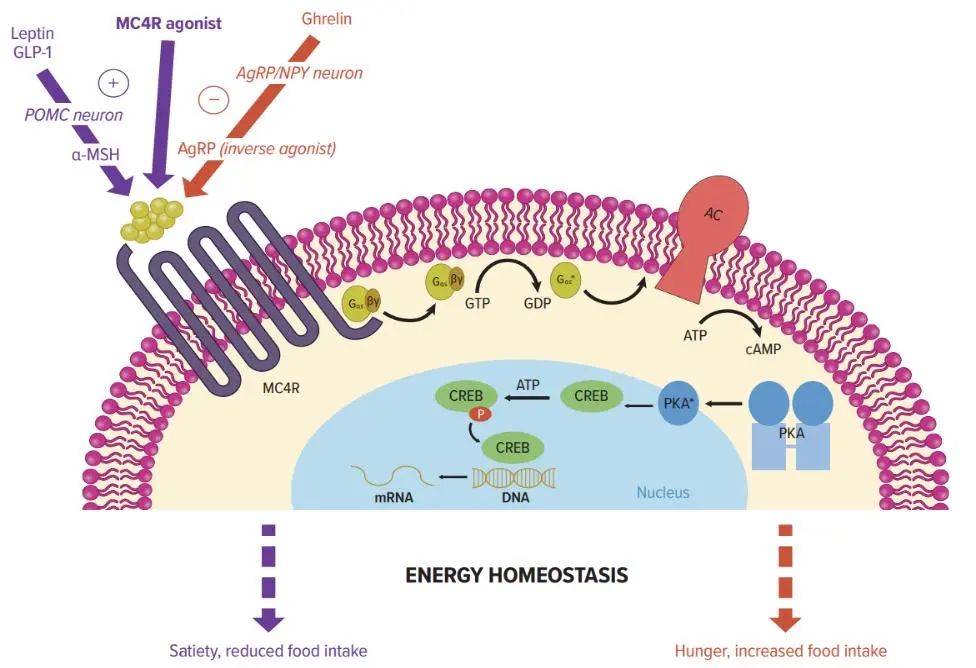 α - 促黑素細(xì)胞激素(α-MSH)對黑皮質(zhì)素受體4(MC4R)的激活會導(dǎo)致G蛋白(Gαs)活化,隨后腺苷酸環(huán)化酶(AC)被激活,AC將三磷酸腺苷(ATP)轉(zhuǎn)化為環(huán)磷腺苷酸(cAMP)。環(huán)磷腺苷酸(cAMP)介導(dǎo)的蛋白激酶A(PKA)的活化會導(dǎo)致PKA復(fù)合物催化亞基的解離。當(dāng)有活性的PKA催化亞基(PKA*)轉(zhuǎn)移至細(xì)胞核后,PKA使轉(zhuǎn)錄因子環(huán)磷腺苷酸反應(yīng)元件結(jié)合蛋白(CREB)磷酸化。當(dāng)環(huán)磷腺苷酸反應(yīng)元件結(jié)合蛋白 - 磷酸化(CREB-P)與上游一致性DNA序列(環(huán)磷腺苷酸反應(yīng)元件,CRE)結(jié)合時,它通過與核心轉(zhuǎn)錄機制相互作用來促進代謝與能量平衡調(diào)節(jié)相關(guān)基因轉(zhuǎn)錄。
